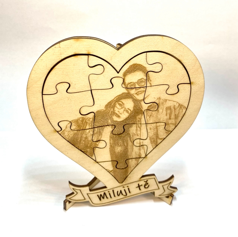 Níže nám pošlete vaši fotografii, kterou chcete vygravírovat na dřevo. Puzzle přesně pasuje do šablony, kde si zvolíte vlastní text. Dostanete i stojánek, který je v ceně.
